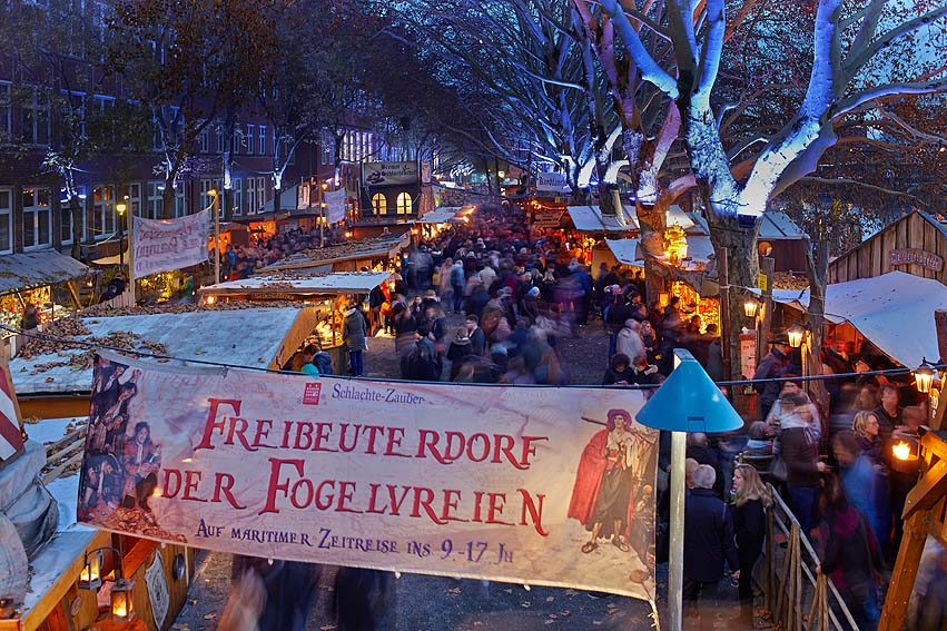Kunsthandwerker ihre individuellen Geschenkideen an. Angekommen an den mächtigen Holzpalisaden erwartet die Gäste das Freibeuterdorf: Hier warten schon Schmied, Filzer oder Kerzenzieher, die dort wie vor hunderten Jahren ihre Handwerkskunst anbieten. Ob Räuberspieße, Fruchtwein oder deftiges Brot – landes typischen Speis und Trank gibt es an den Piratenschenken und Tavernen.